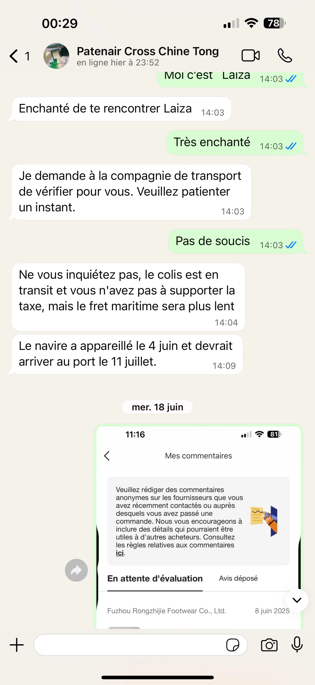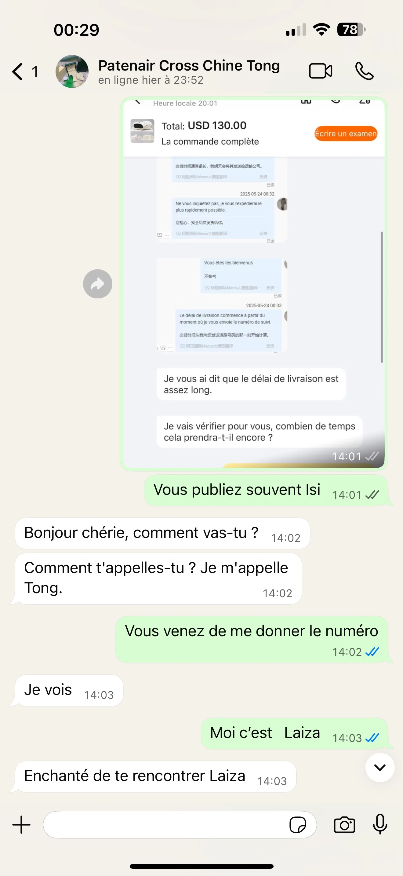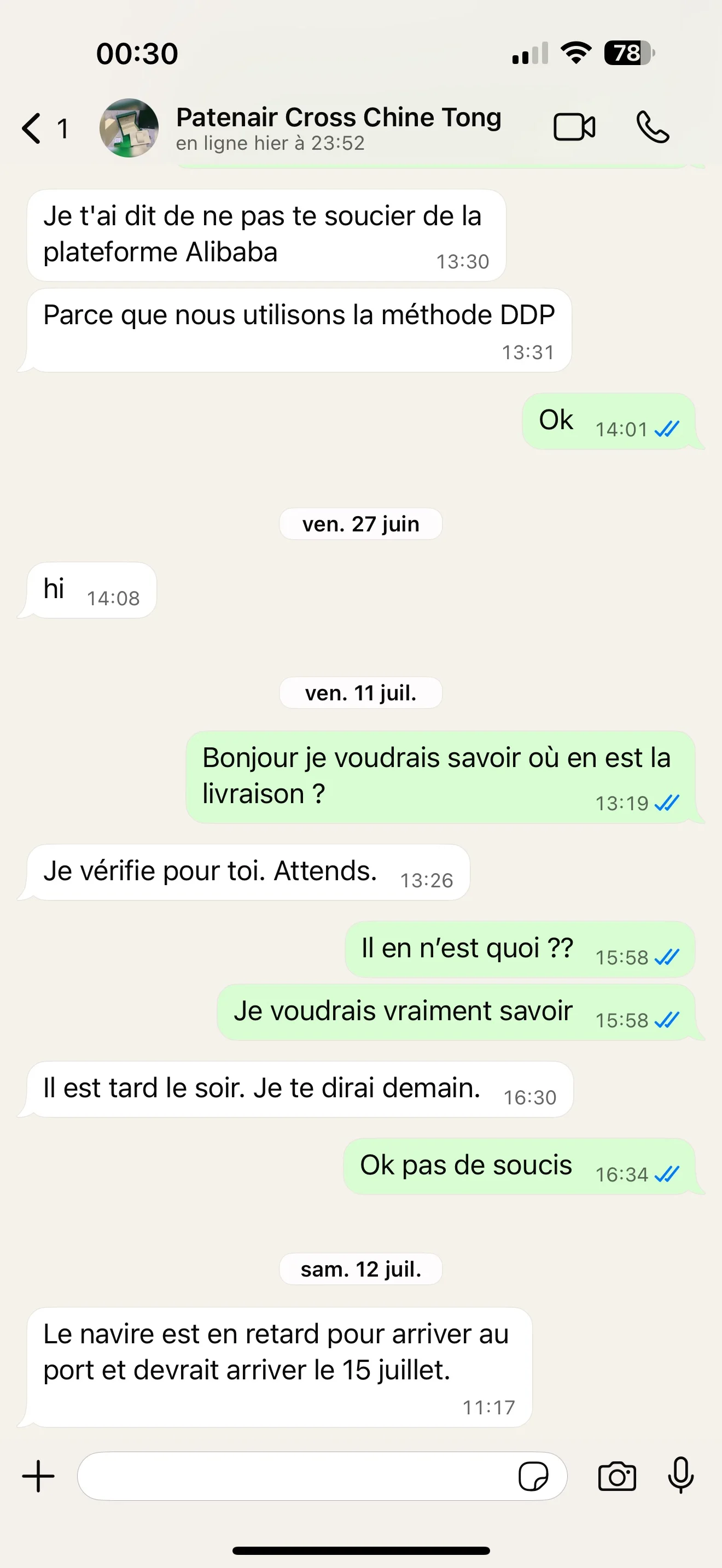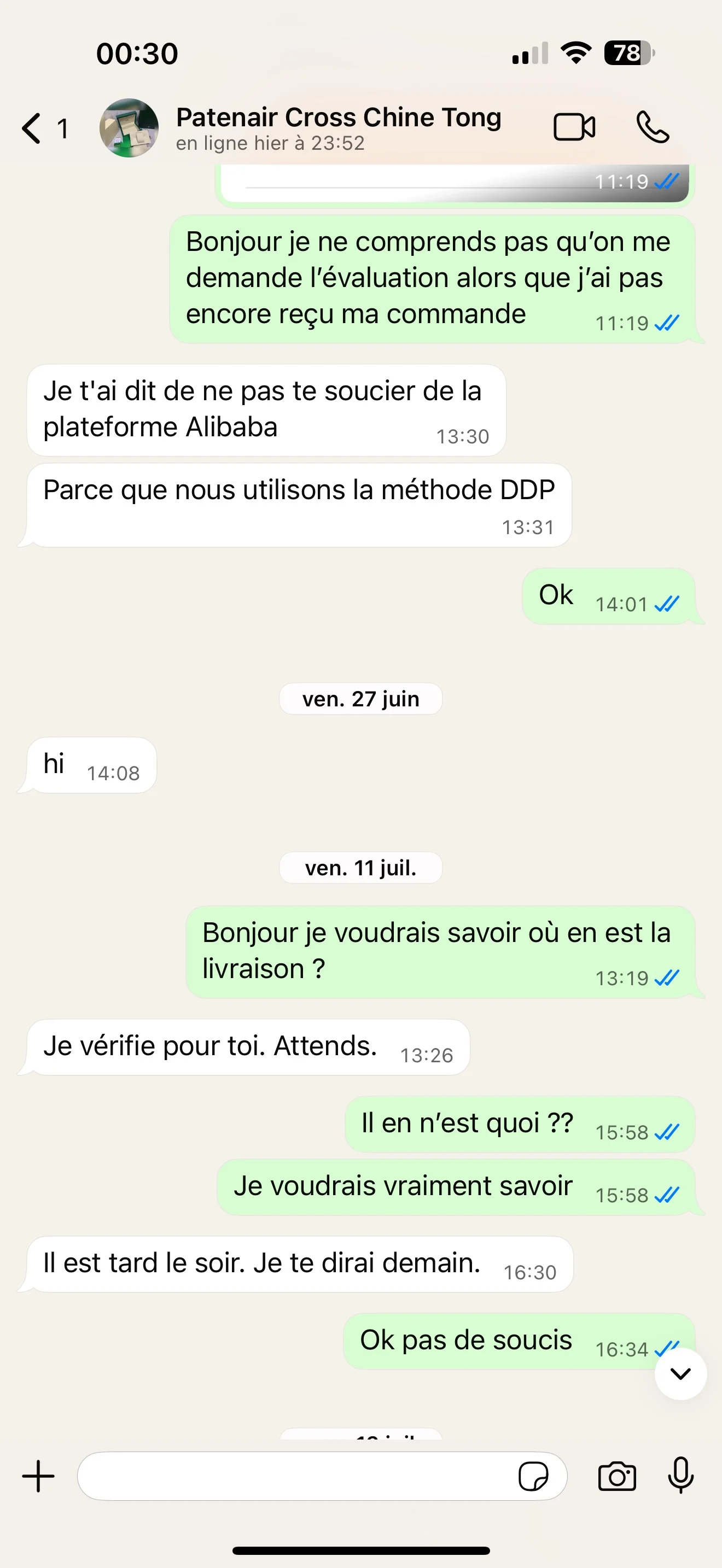 Je vous ai déjà dit que votre produit était livré et que l'expédition DDP était la solution logistique la plus économique que vous ayez choisie. Je vous ai également indiqué le délai de livraison. Pourquoi avez-vous fait cela ? Nous avons discuté du délai de livraison et vous l'avez accepté. Pourquoi me donnez-vous un avis négatif ? Vous voulez une logistique bon marché et DDP. Vous manquez de patience ? Je vous aiderai selon vos exigences, mais pourquoi me traitez-vous ainsi ?